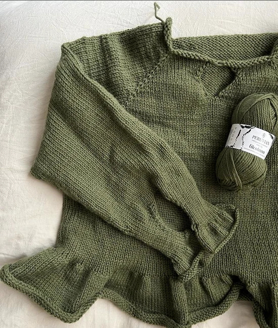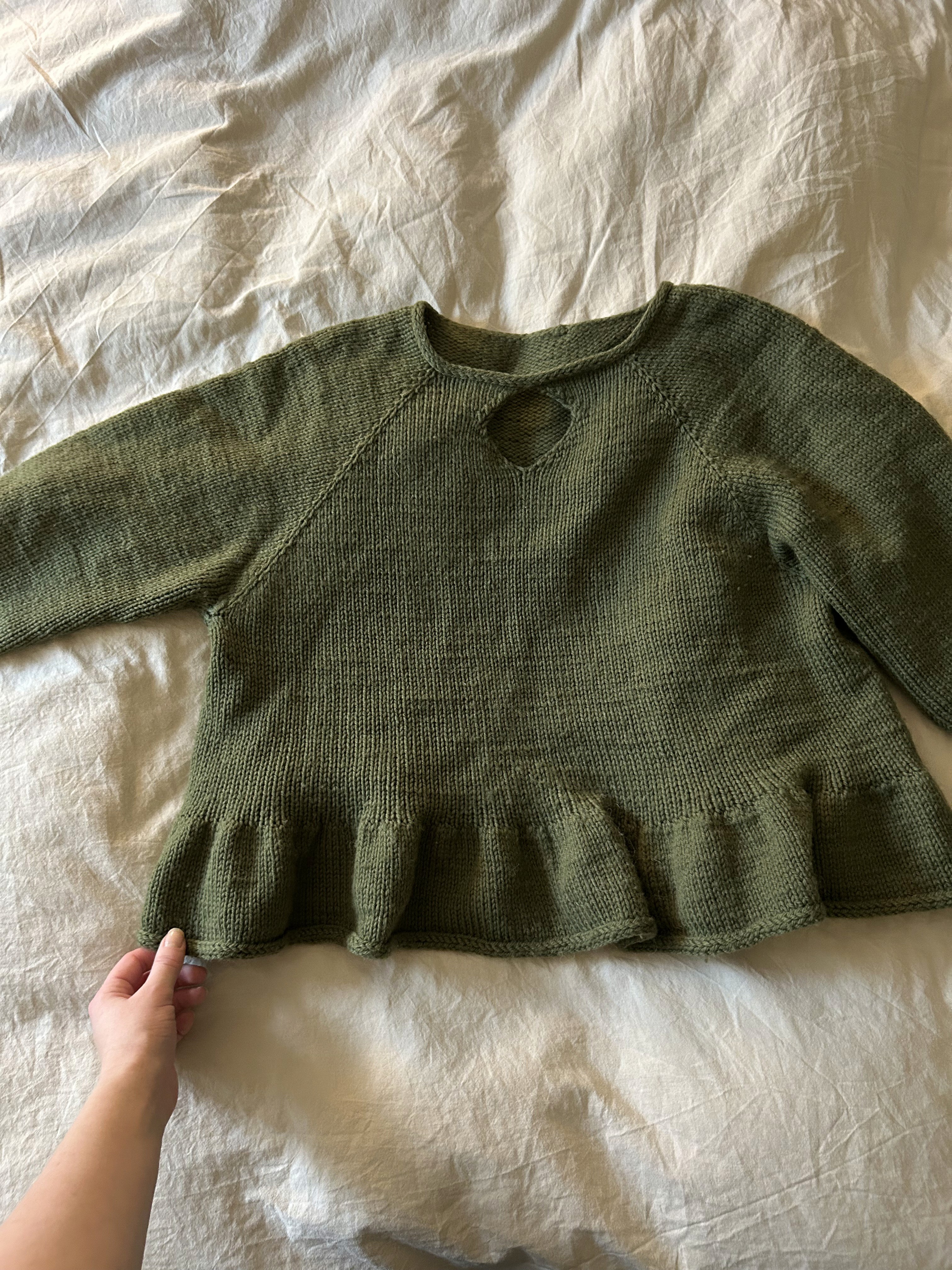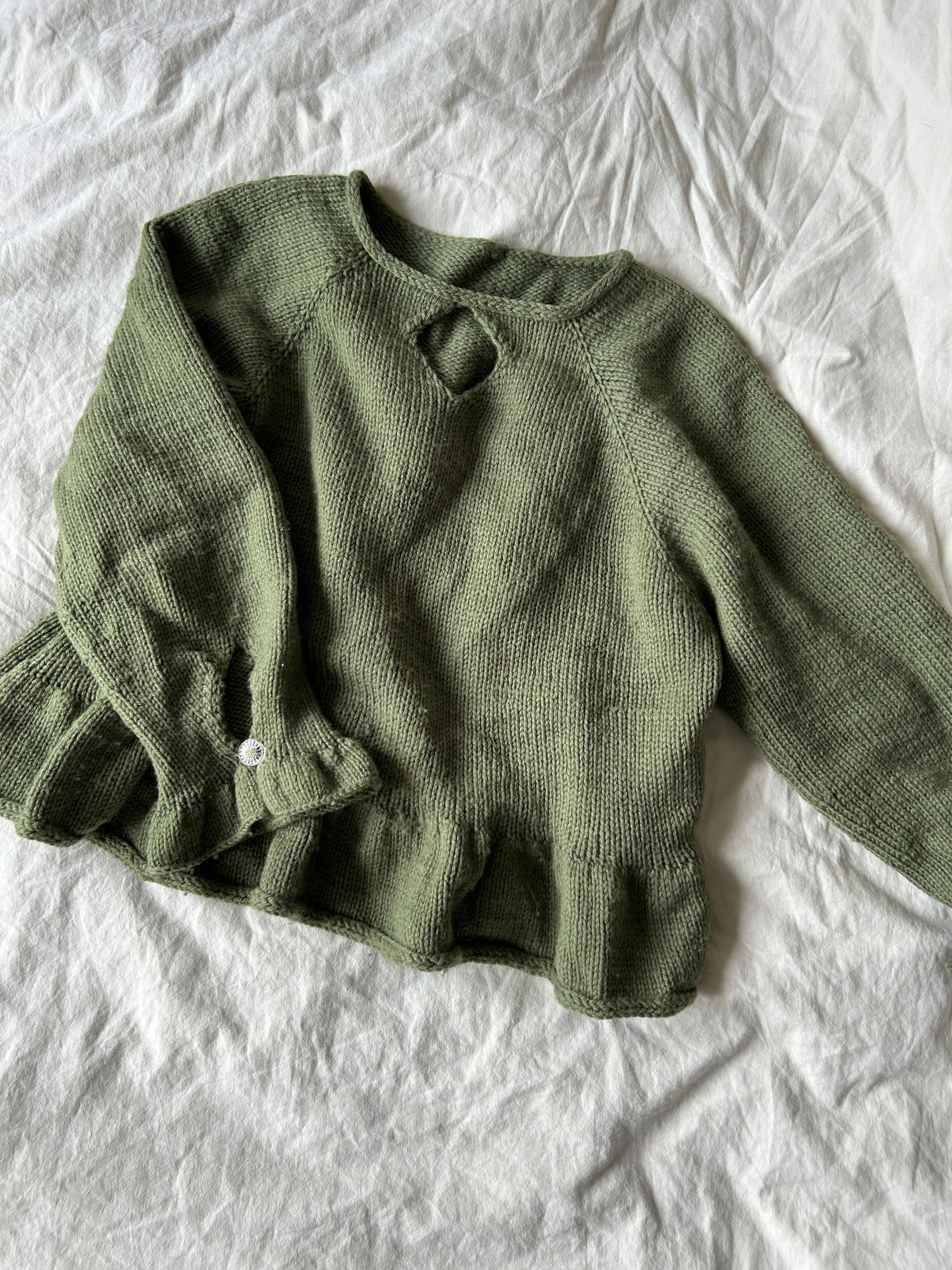 Love Bluse strikkes oppefra og ned. Først strikkes frem og tilbage imens fordybningen på forstykket strikkes, herefter strikkes blusen rundt. Blusens krop afsluttes med en flæse og ærmerne afsluttes med en lille flæse og en knap.