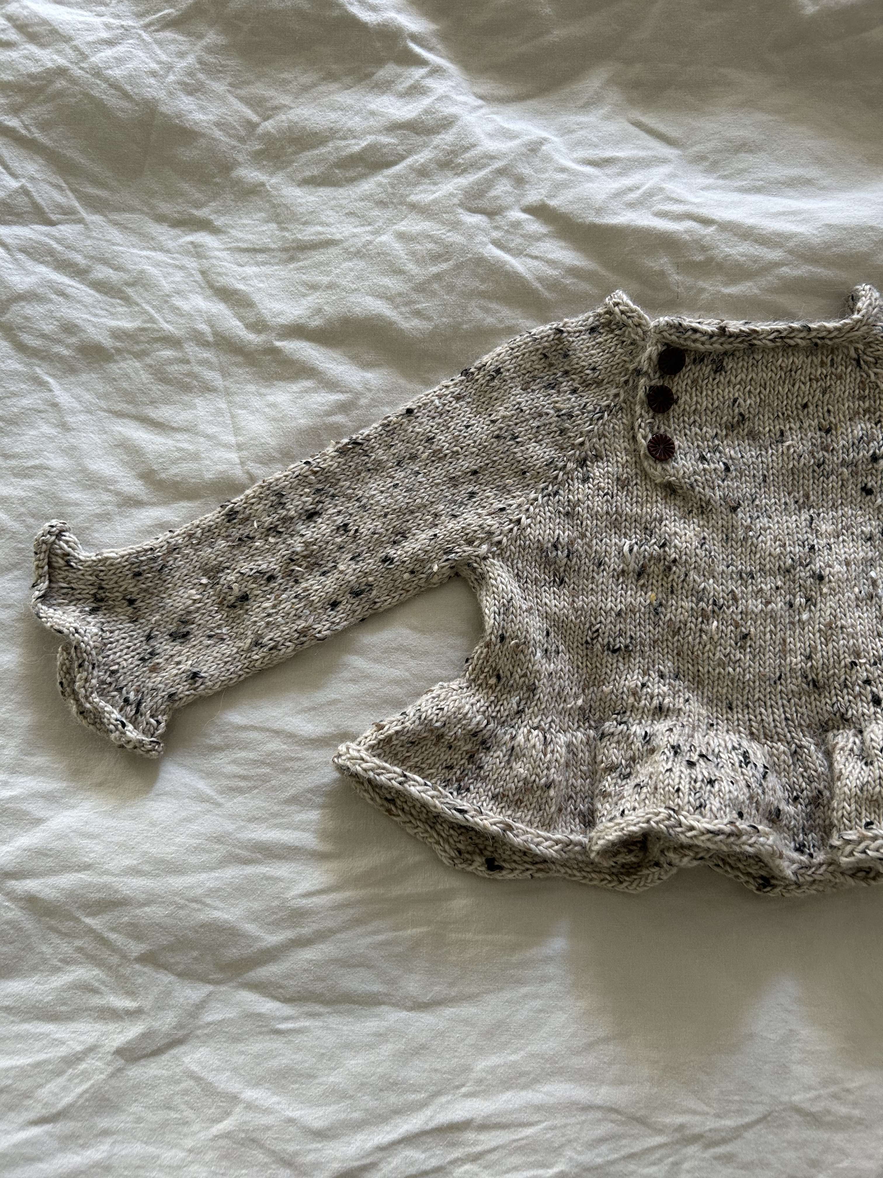 Love Bluse Mini strikkes oppefra og ned. Først strikkes frem og tilbage imens åbningen på forstykket strikkes, herefter strikkes blusen rundt. Blusens krop afsluttes med en flæse og ærmerne afsluttes med en lille flæse.