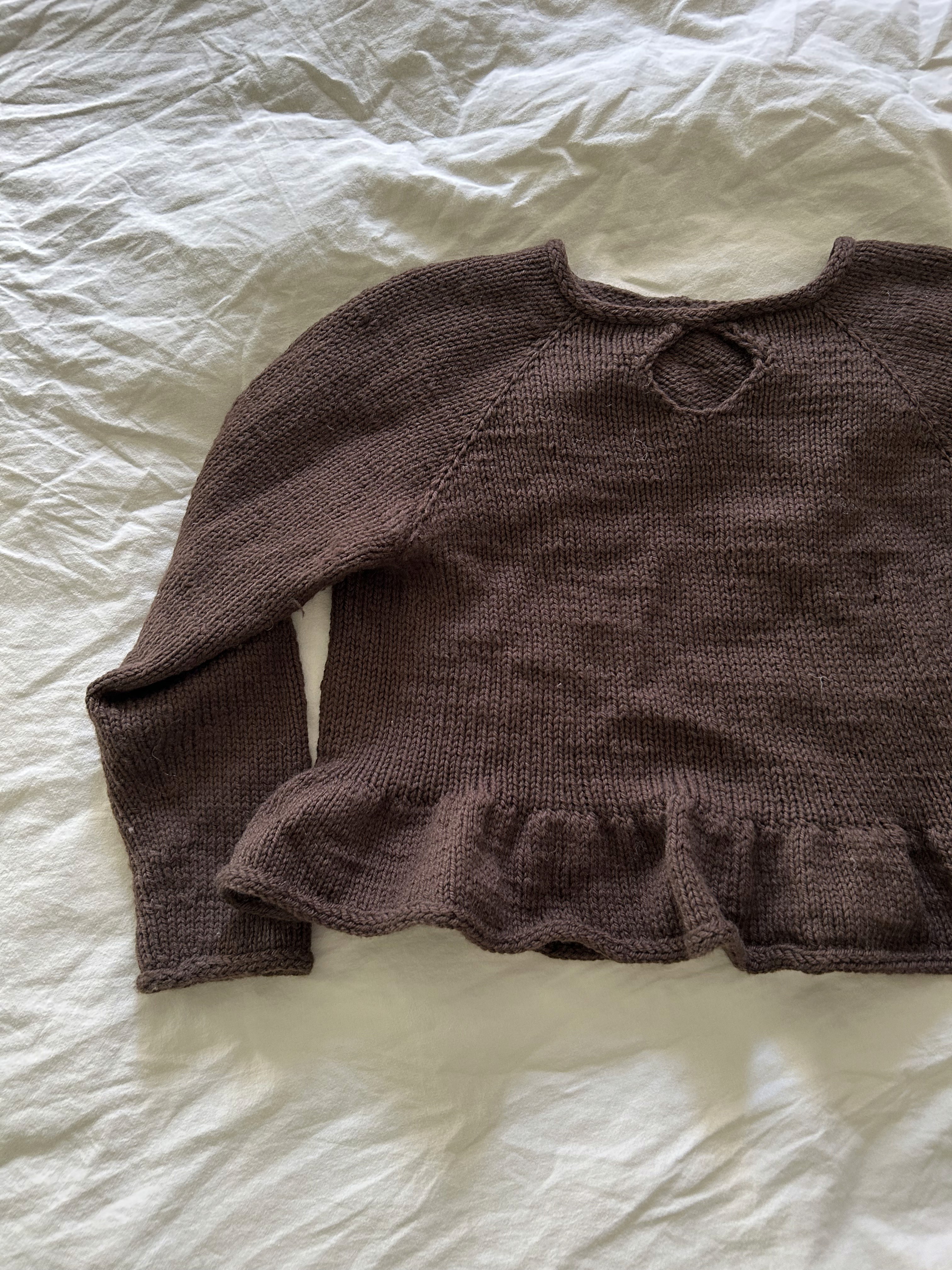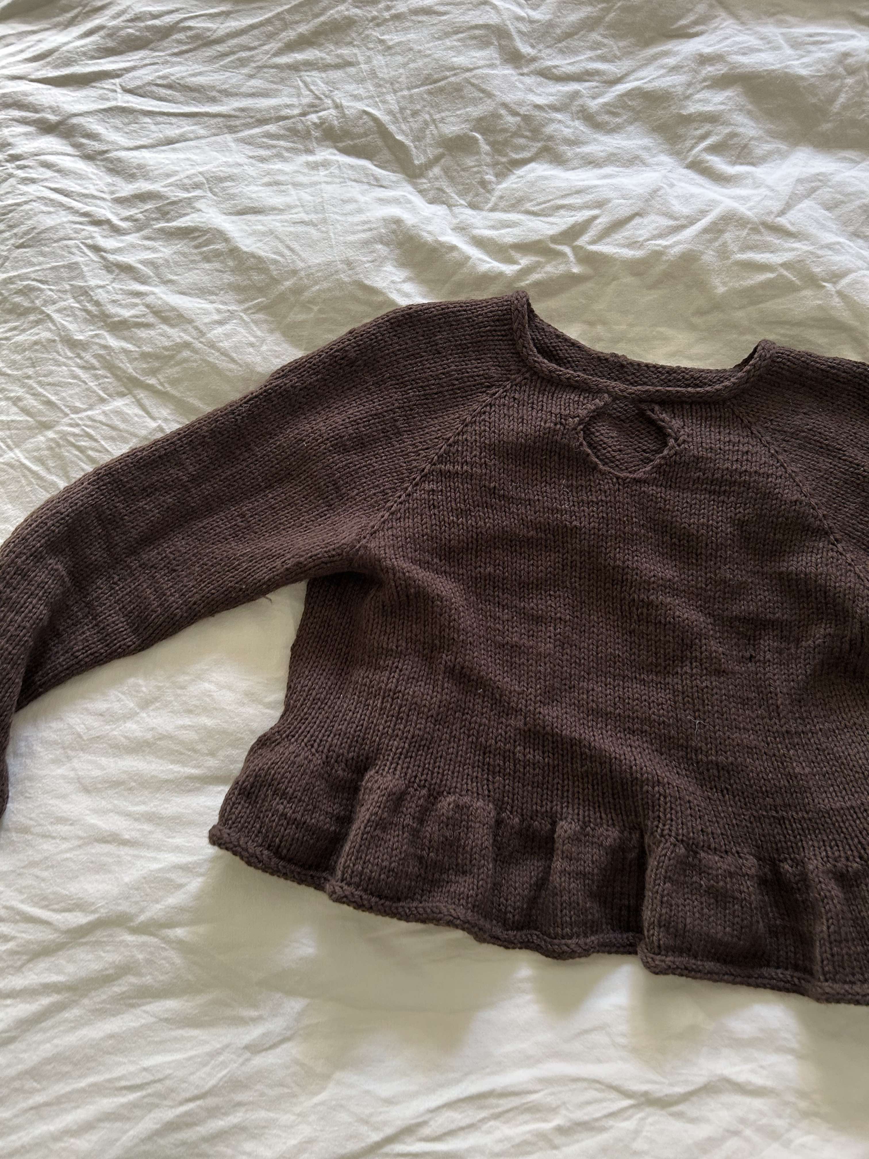 Love Blouse no. 2 strikkes oppefra og ned. Først strikkes frem og tilbage imens fordybningen på forstykket strikkes, herefter strikkes blusen rundt. Blusens krop afsluttes med en flæse der giver et find og feminint look.